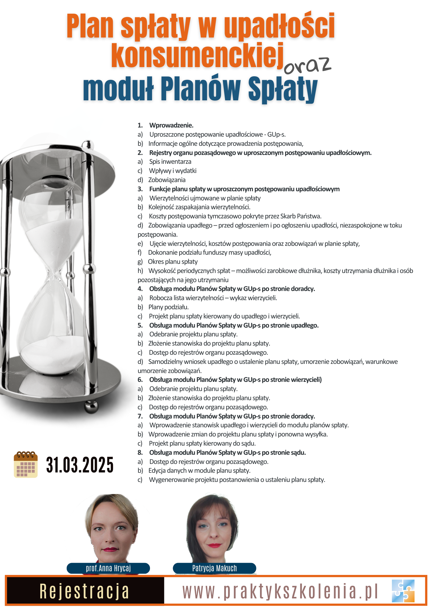 Szkolenie jest przeznaczone przede wszystkim dla doradców restrukturyzacyjnych, którzy pełnią funkcje syndyków w postępowaniach upadłościowych osób fizycznych, głównie w ramach upadłości konsumenckiej. Przedmiotem szkolenia będą merytoryczne, formalne oraz techniczne kwestie związane z ustalaniem planu spłaty w postępowaniu upadłościowym.