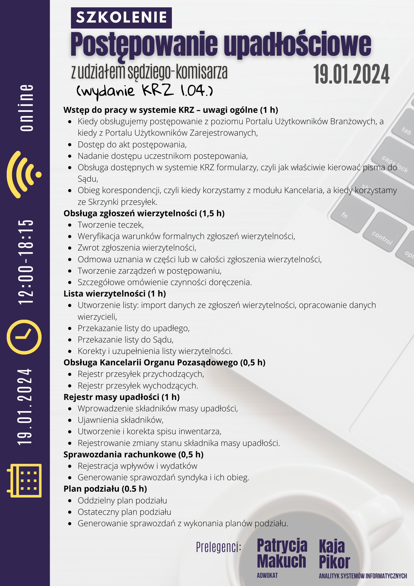 Szkolenie odbędzie się 19.01.2024 r., godz. 12:00-18:15