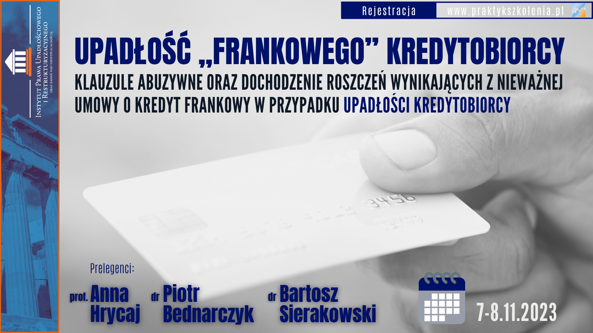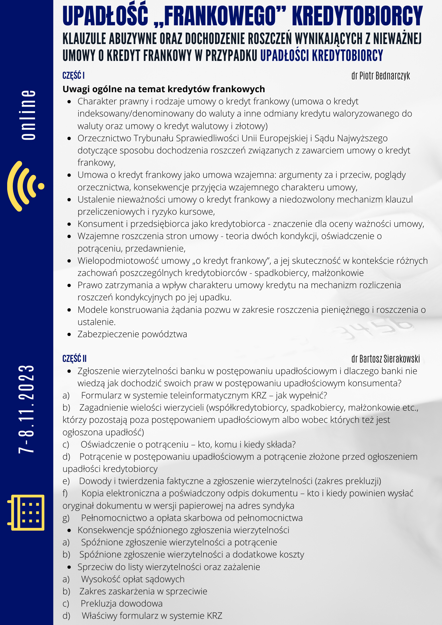 Przedmiotem szkolenia są zagadnienia dotyczące wpływu ogłoszenia upadłości kredytobiorcy na dochodzenie roszczeń przez tego kredytobiorcę wynikających z umowy o kredyt frankowy, która zawiera klauzule abuzywne. Szkolenie jest drugim szkolenie z tego zakresu, po szkoleniu, które dotyczyło dochodzenia roszczeń przez kredytobiorców w przypadku ogłoszenia upadłości banku – kredytodawcy. Pierwszego dnia szkolenia zostaną przedstawione zagadnienia ogólne dotyczące umowy o kredyt frankowy, zawierającej klauzule abuzywne, w tym najnowsze orzecznictwo sądów polskich i Trybunału Sprawiedliwości. Drugiego dnia zostaną omówione zagadnienia dotyczące upadłości konsumenckiej i dochodzenia roszczeń banku wobec konsument, w tym wpływ ogłoszenia upadłości konsumenta na procesy z jego udziałem. W ramach suplementu do poprzedniego szkolenia zostanie również poruszona bardzo istotna i szeroko dyskutowana obecnie kwestia związana z zabezpieczaniem wierzytelności konsumentów w przypadku ogłoszenia upadłości banku.