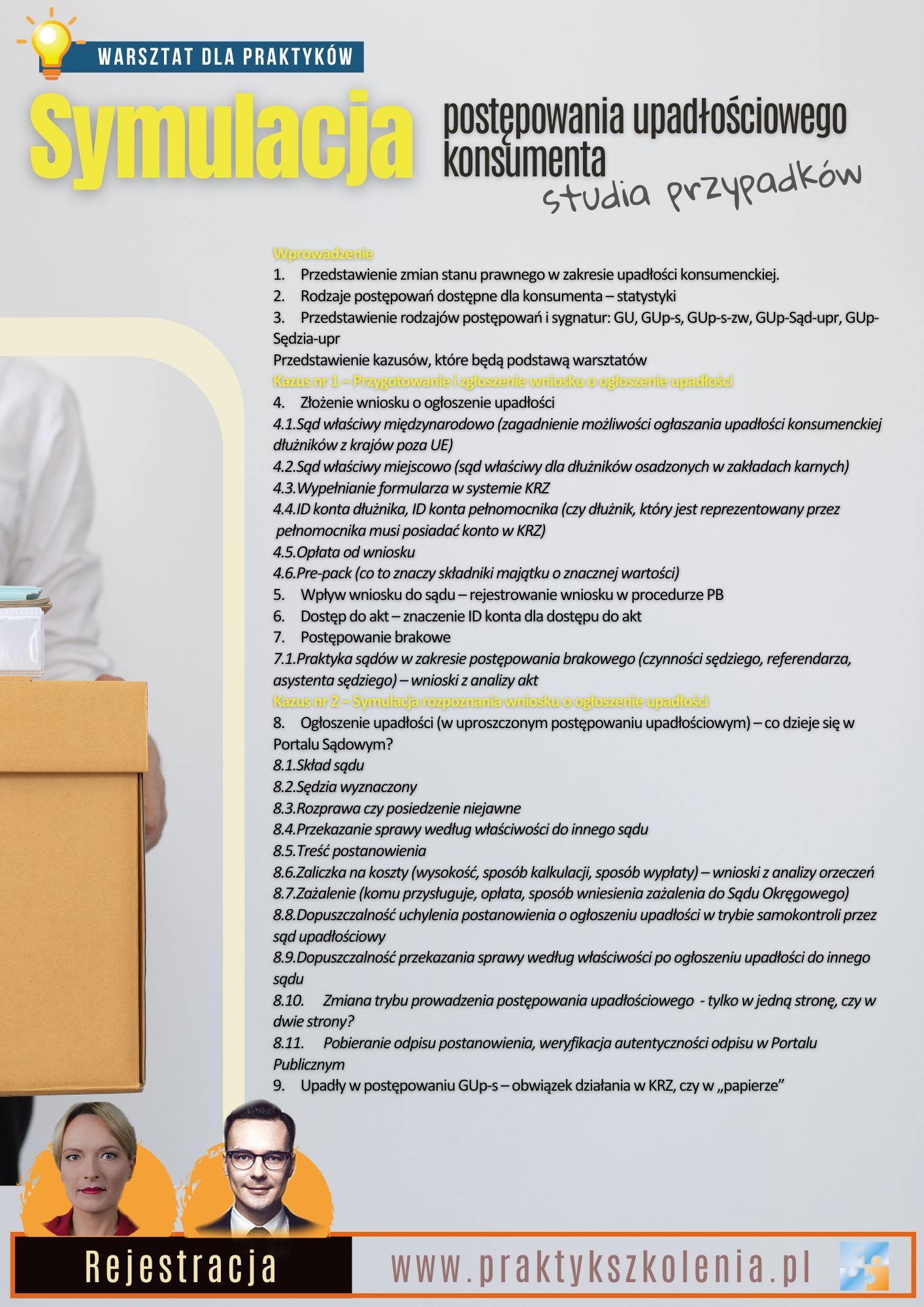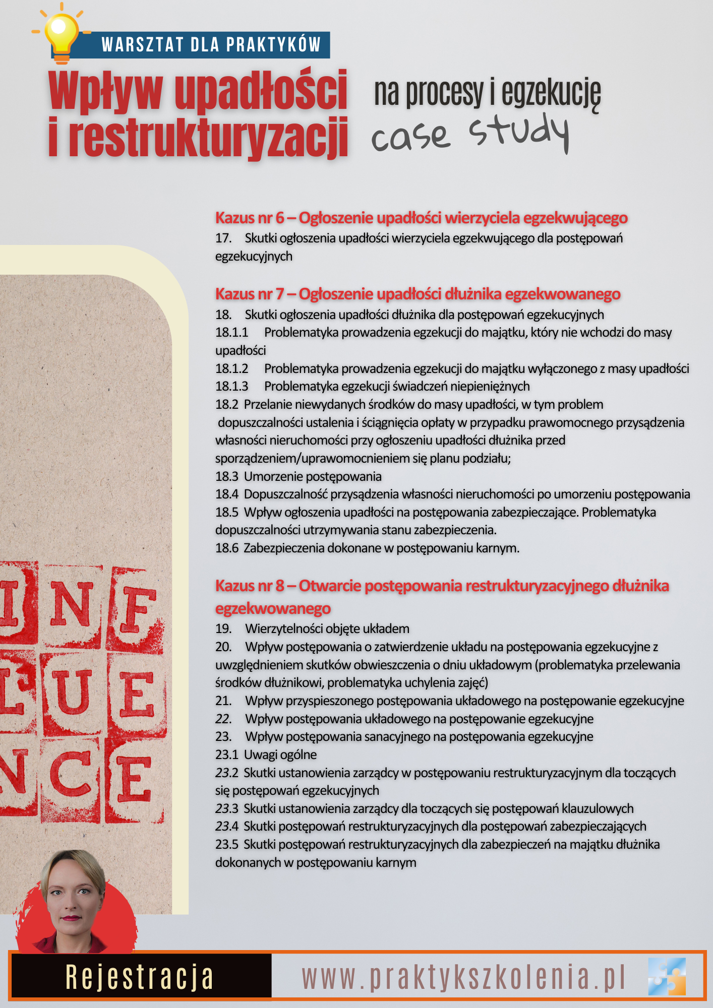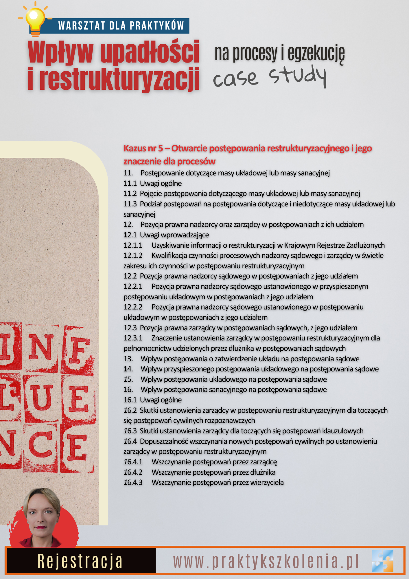 Warsztaty z zakresu wpływu upadłości i restrukturyzacji na procesy i egzekucję mają charakter kazusowy. Będą oparte na analizie stanów faktycznych, które pojawiły się w praktyce doradców restrukturyzacyjnych. Celem warsztatów jest wykształcenie praktycznych umiejętności obsługi procesów i egzekucji prowadzonych z udziałem syndyka, nadzorcy sądowego albo zarządcy.