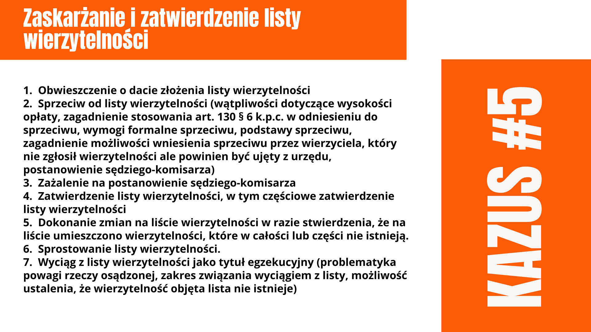 Warsztaty z zakresu zgłoszenia wierzytelności oraz listy wierzytelności mają charakter kazusowy. Będą oparte na analizie stanów faktycznych, które pojawiły się w praktyce doradców restrukturyzacyjnych. Celem warsztatów jest wykształcenie praktycznych umiejętności obsługi zgłoszeń wierzytelności i tworzenia listy wierzytelności.
