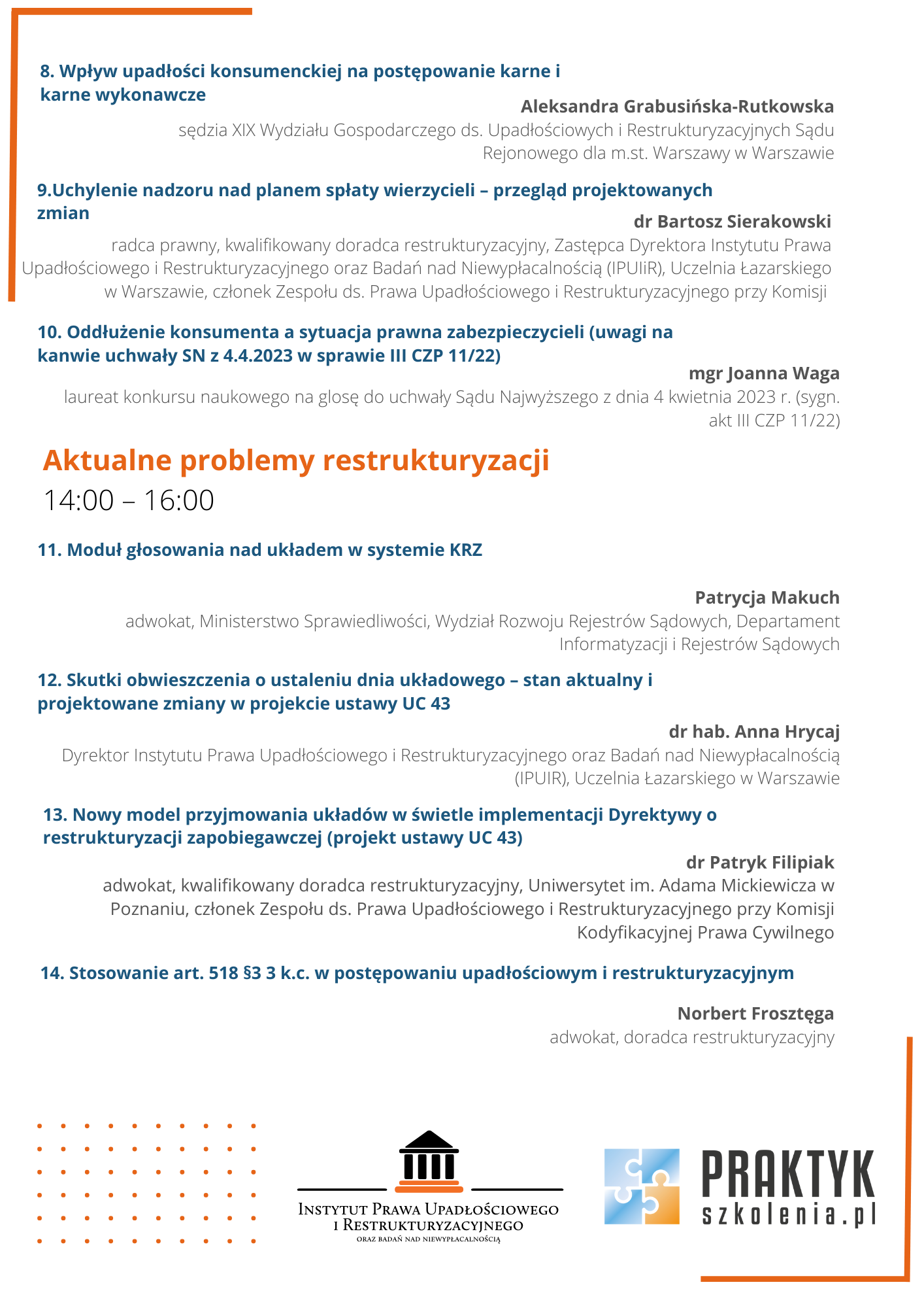 Konferencja jest przeznaczona dla praktyków prawa upadłościowego i restrukturyzacyjnego (doradców restrukturyzacyjnych, sędziów oraz pełnomocników dłużników i wierzycieli). Nastawiamy się na maksymalnie praktyczny wymiar i wsparcie dla uczestników konferencji w rozwiązywaniu problemów pojawiających się w praktyce.
